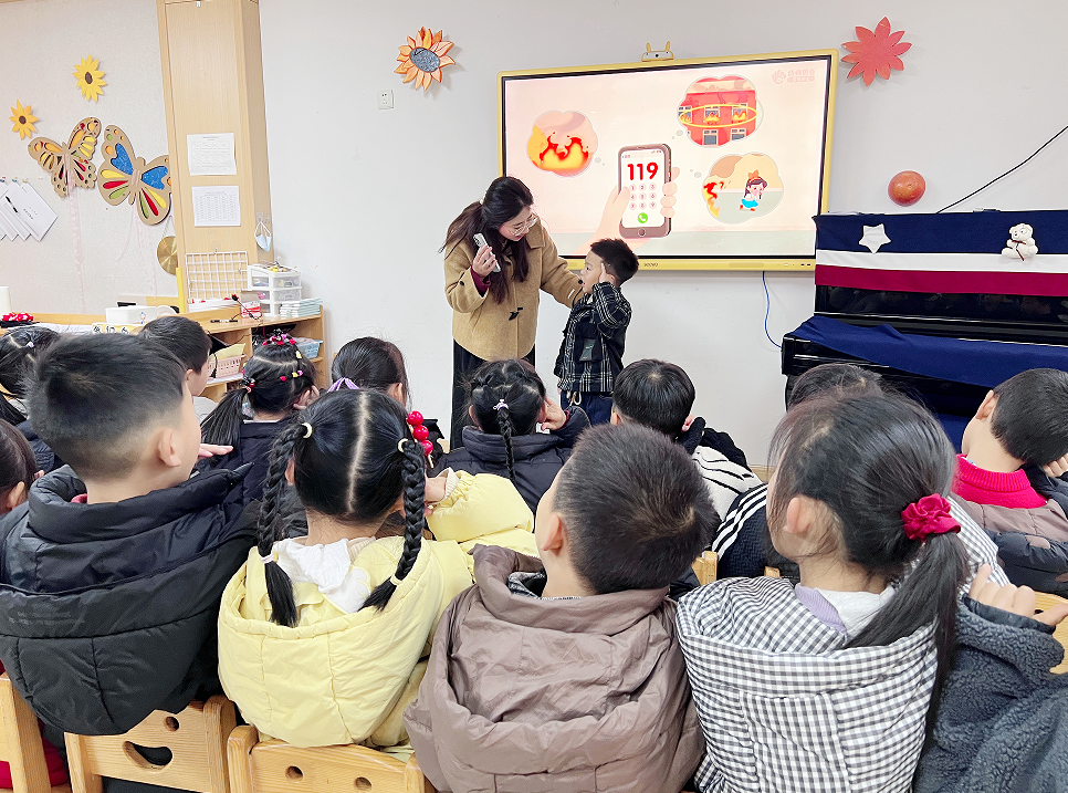 在班級安全教育課堂上,老師們巧妙運用色彩鮮艷的圖片,將禁止玩火標識、火災(zāi)報警電話等知識生動展現(xiàn)。小朋友們踴躍互動,稚嫩的聲音喊出“著火了要打119”,課堂氛圍十分活躍。