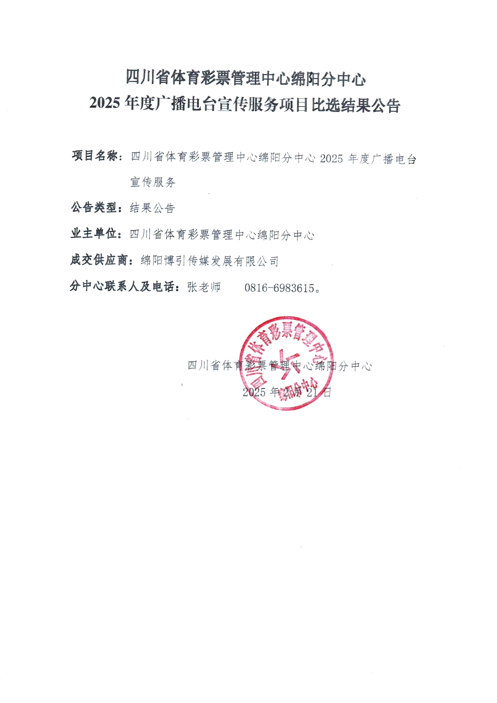 四川省體育彩票管理中心綿陽(yáng)分中心2025年度廣播電臺(tái)宣傳服務(wù)項(xiàng)目比選結(jié)果公告