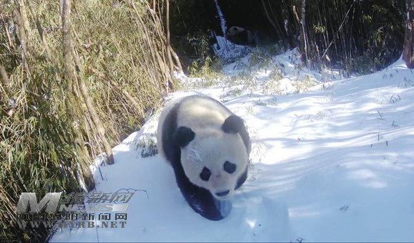 雪地上,一只圓滾滾的大熊貓向紅外相機(jī)走來。