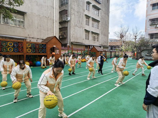 在實(shí)操環(huán)節(jié),教師們從基礎(chǔ)動作到進(jìn)階技能逐項突破。依次進(jìn)行了單手拍、左右手交替拍、雙手拍球、行進(jìn)間運(yùn)球等動作技能的學(xué)習(xí),同時現(xiàn)場模擬幼兒課堂場景,分組設(shè)計“籃球主題游戲方案”,融合故事、音樂、跨學(xué)科元素,探索“玩中學(xué)”的創(chuàng)新路徑。