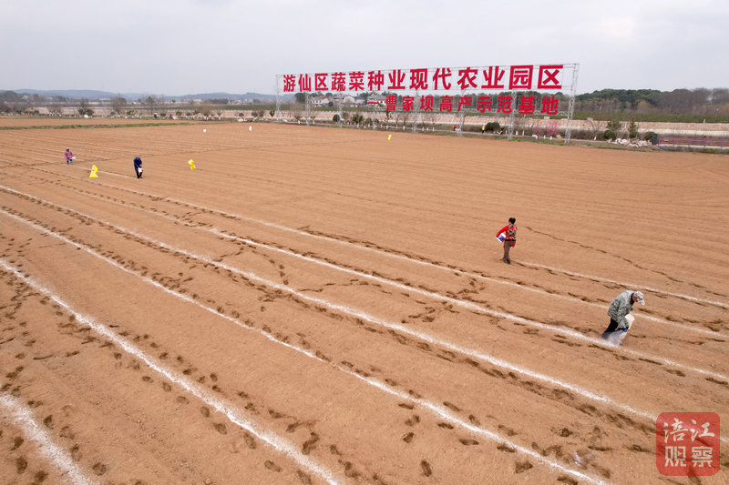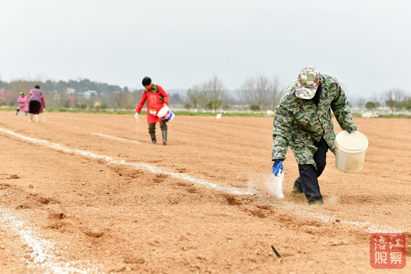 在油菜地的另一邊,農戶們在忙著耕種,拉標線、撒底肥……松軟的泥土中嵌進一串串深淺不一的腳印。