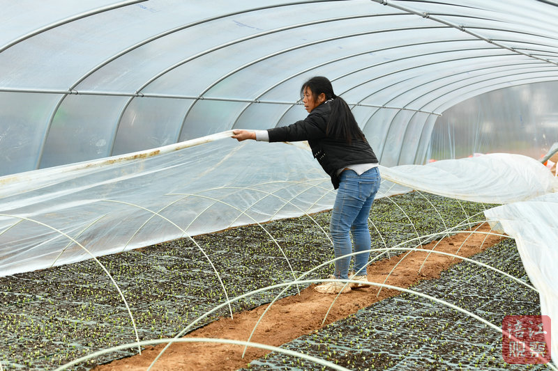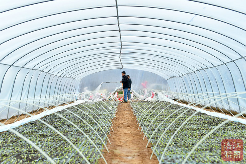 在不遠處的兩座大棚內,瓜農夫妻倆正細心地為剛破土而出的幼苗淋水。今年,他們計劃種植70畝西瓜,十幾天后將雇傭更多的人來栽苗。