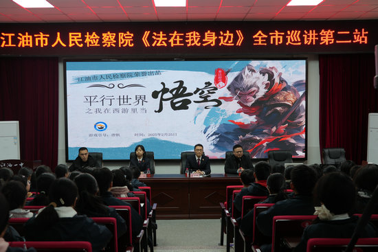 講座中,江油市第五檢察部副主任唐帆化身說書人以大家耳熟能詳?shù)摹段饔斡洝分袑O悟空的經(jīng)歷為主線,巧妙地融入了校園欺凌、禁毒和預(yù)防網(wǎng)絡(luò)性侵害三個重要主題,讓法治知識如同一股清泉,緩緩流入同學們的心田。