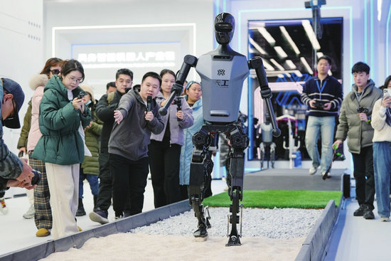 在北京“機器人大世界”,參觀者在參觀人形機器人“天工”的行進展示(2月24日攝)。(新華社記者 鞠煥宗 攝)