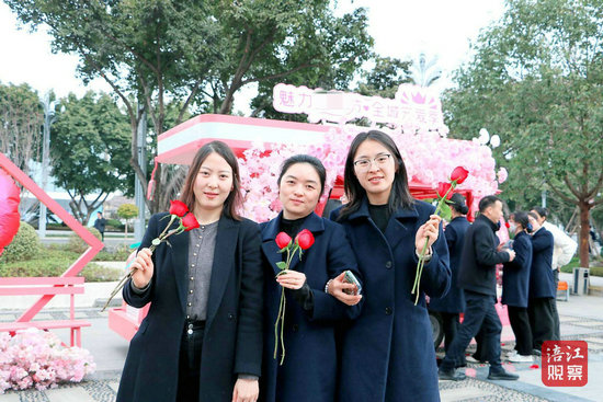 綿陽新聞網(wǎng)訊 “快看!那里有一輛粉色巴士!”3月6日中午,在園藝山集中辦公區(qū),一輛載滿粉色玫瑰的流動打卡車停在廣場上,聞訊而來的姑娘們將車圍得水泄不通。這輛“婦女節(jié)移動盲盒”特別班車,正在開啟一場春日限定的浪漫奇遇記。