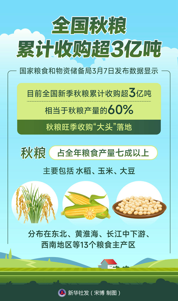 新華社北京3月7日電(記者王立彬)國(guó)家糧食和物資儲(chǔ)備局7日發(fā)布數(shù)據(jù)顯示,目前全國(guó)新季秋糧累計(jì)收購(gòu)超3億噸,相當(dāng)于秋糧產(chǎn)量的60%,秋糧旺季收購(gòu)“大頭”落地。