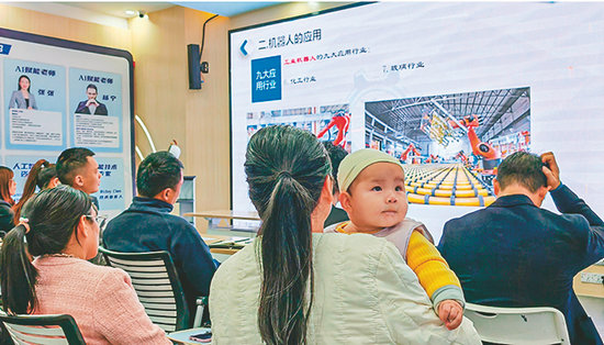 不同的時代,一樣的精神。40多年后的今天,記者同樣在深圳市龍華區(qū)福城街道章閣社區(qū)的“AI夜校”課堂上看到,正在開展的工業(yè)機器人基礎操作培訓課上,一名女士懷抱孩子認真聽課。