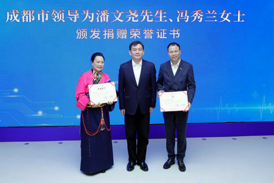 3月18日,在四川省成都濟(jì)仁血液透析中心,西班牙華僑華人協(xié)會副主席潘文堯(右)和中國內(nèi)地企業(yè)家馮秀蘭(左)獲頒捐贈榮譽(yù)證書。新華社記者 沈伯韓 攝