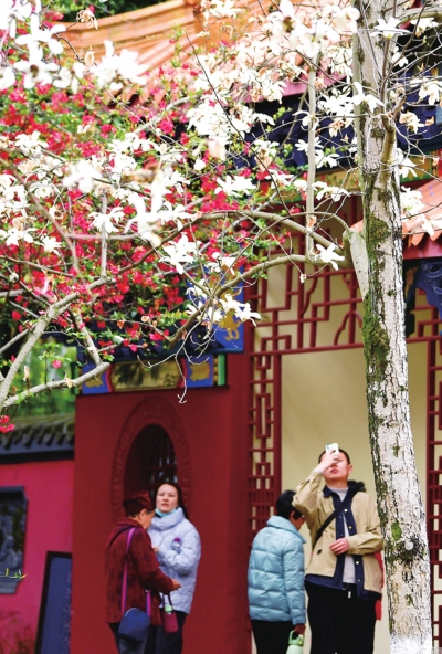 三月春濃,綿陽城區(qū)西山公園的玉蘭花正值盛放期,吸引著許多市民和游客駐足觀賞拍照。