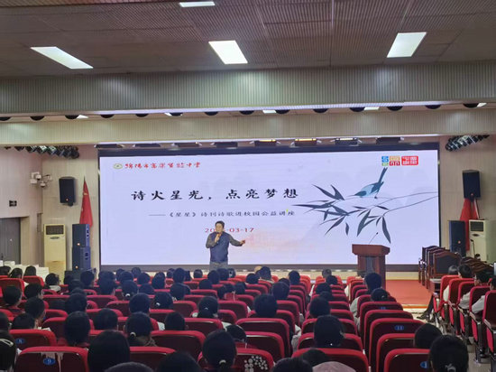 綿陽新聞網(wǎng)訊 當(dāng)三月的春風(fēng)掀開詩卷的扉頁,富樂實驗中學(xué)的禮堂仿若搖身一變,化作一片熠熠生輝的璀璨星空。著名詩人黎陽攜著《星星》詩刊所獨有的墨香,踏入綿陽市富樂實驗中學(xué)校園,為師生們開展了以“詩火星光 點亮夢想”為主題的2025年公益講座活動。