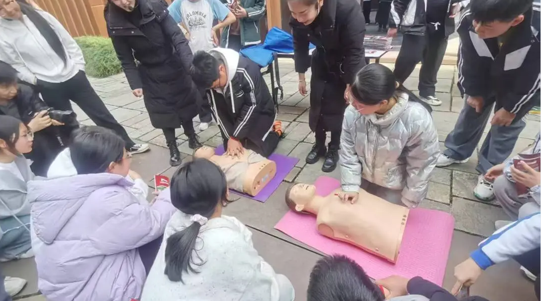 隨后,學(xué)生們走進(jìn)北川地震博物館。館內(nèi)豐富的圖文資料、實(shí)物展品以及多媒體展示,生動(dòng)再現(xiàn)了地震災(zāi)難和災(zāi)后重建的全過程。在博物館內(nèi),學(xué)生系統(tǒng)學(xué)習(xí)了地震科學(xué)知識、抗震救災(zāi)精神及防災(zāi)減災(zāi)技術(shù),展館內(nèi)實(shí)物展品、互動(dòng)模型和沉浸式影像引發(fā)學(xué)生熱烈討論。參觀結(jié)束后,隨行老師現(xiàn)場教學(xué),“急救技能小課堂”,指導(dǎo)學(xué)生進(jìn)行傷口包扎、心肺復(fù)蘇等實(shí)操訓(xùn)練,學(xué)生們認(rèn)真學(xué)習(xí)、積極實(shí)踐,通過分組演練強(qiáng)化應(yīng)急自救互救能力。