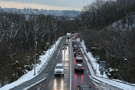 這是2024年11月21日拍攝的白雪映襯下的烏克蘭首都基輔右岸沿河公路。新華社記者李東旭攝