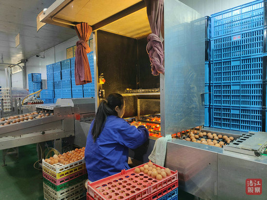 4棟雞舍產出的新鮮種蛋被傳送運輸至蛋庫的流水線。在這里,四五個工作人員與機器設備配合默契:肉眼初步挑選、光照二次篩選、機器稱重分揀……經(jīng)過標準流程,剔除不合格種蛋,合格種蛋則被打包送進熏蒸室消毒。工作人員說,平均每天經(jīng)此流程處理的種蛋超過10萬枚。