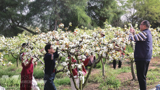游客在梨園拍照打卡
