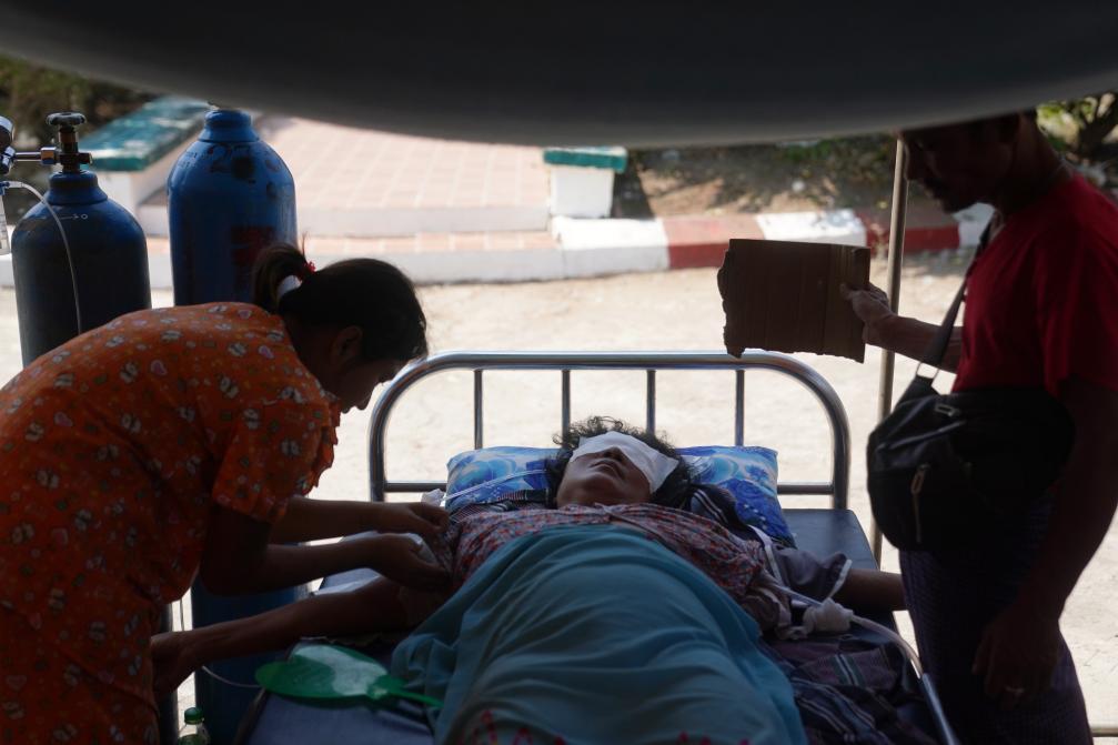 3月31日,在緬甸首都內(nèi)比都,地震傷員在一家醫(yī)院空地搭建的帳篷中接受治療。新華社發(fā)(王申攝)