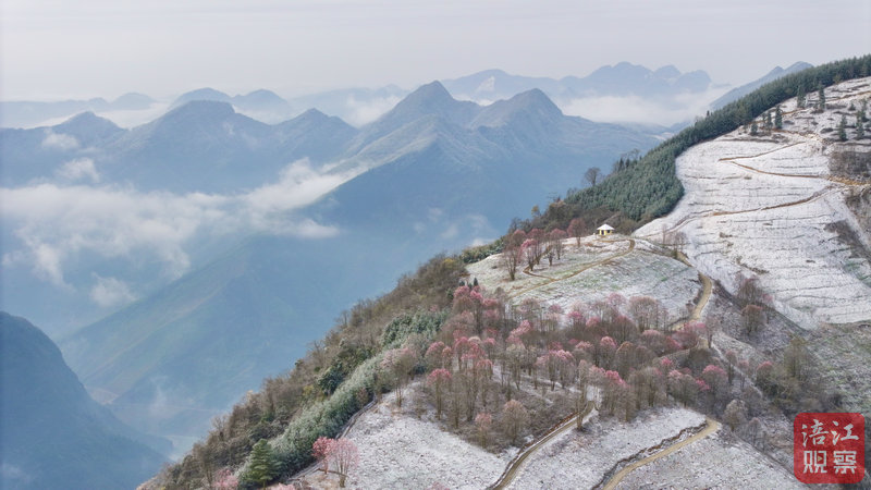 在海拔超2000米的寶桃村山巔,這場(chǎng)春雪與花事的邂逅更顯震撼。冰晶包裹的花瓣如同天然雕琢的水晶藝術(shù)品,遠(yuǎn)山黛色與雪中粉韻構(gòu)成層次分明的山水畫卷,引得游客驚嘆連連。