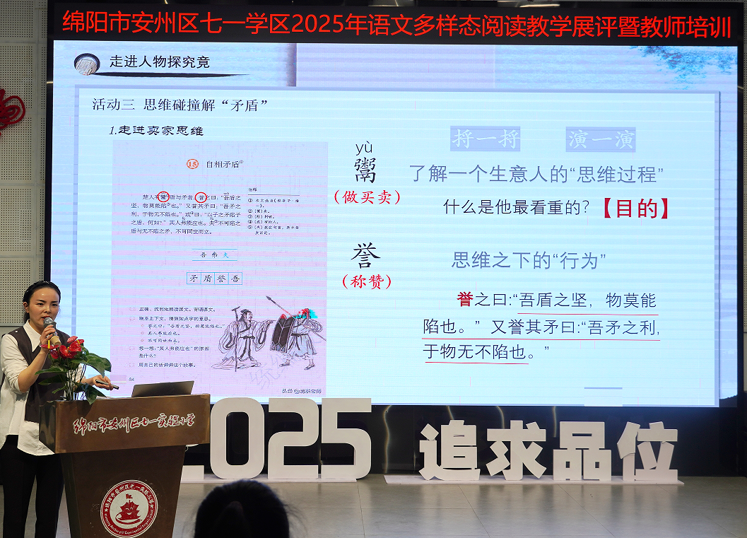 活動中,8位教師圍繞統(tǒng)編教材創(chuàng)新閱讀教學實踐。劉佩青創(chuàng)設“時光博物館”,以雙文比讀解碼寫作技巧,用成長時間軸串連童年記憶,創(chuàng)新融合敘事支架與感恩教育,讓語文課化作生命對話場域。張維琴解構《自相矛盾》,借“字詞尋寶”破解文言密碼,通過楚人角色模擬與邏輯漏洞辯論,架設古今思辨橋梁,引導學生在生活實踐中理性納諫。蘇碧蓉依托《田忌賽馬》設計分層任務鏈,從“對陣圖”策略推演到實戰(zhàn)寫作,以角色穿越激活歷史智慧,培育破局思維與創(chuàng)新表達力。王逸梅運用思維導圖拆解寓言悖論,結合漫畫改編、廣告詞創(chuàng)作等創(chuàng)意作業(yè),讓文言智慧照進現(xiàn)實矛盾分析。丁熙平聚焦《跳水》構建“動詞鏈”危機推演模型,通過水手笑因分析與船長決策模擬,鍛造學生應急思辨力。張燕以情景遷移重構楚人賣矛現(xiàn)場,借“坦克矛盾”等生活案例延伸思辨觸角。郭彬彬設計“矛盾PK戰(zhàn)況表”培育古文偵探,續(xù)寫楚人新結局深化邏輯遷移。楊揚緊扣《跳水》結局溯源,通過船長決策鏈還原與水手“笑”因深挖,在采訪模擬中淬煉冷靜思維,讓經(jīng)典煥發(fā)現(xiàn)代思辨光芒。