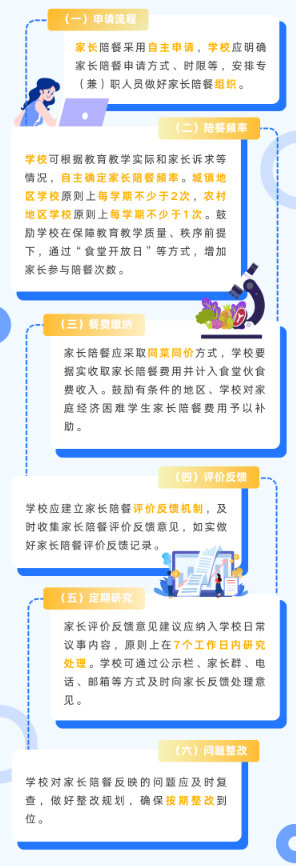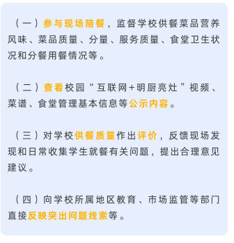 《指引》明確,各地教育主管部門負(fù)責(zé)指導(dǎo)本轄區(qū)學(xué)校有序推行家長陪餐工作,并將家長陪餐實(shí)施情況納入校園食品安全和膳食經(jīng)費(fèi)管理工作日常監(jiān)管內(nèi)容,暢通家長陪餐問題反映直達(dá)渠道。各地教育主管部門要定期收集本轄區(qū)學(xué)校家長陪餐評價(jià)反饋意見,研判分析轄區(qū)內(nèi)家長反映的突出問題和合理建議,指導(dǎo)學(xué)校優(yōu)化供餐管理、提升菜品質(zhì)量。