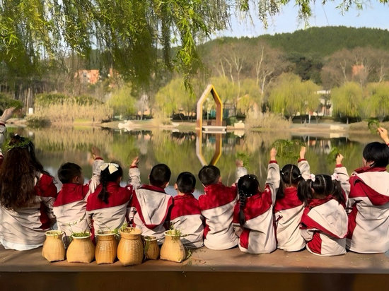 孩子們在老師的帶領(lǐng)下,親手插柳枝、編柳環(huán),戴在頭上嬉戲追逐。“柳樹是春天的使者,插柳代表我們對健康平安的愿望。”