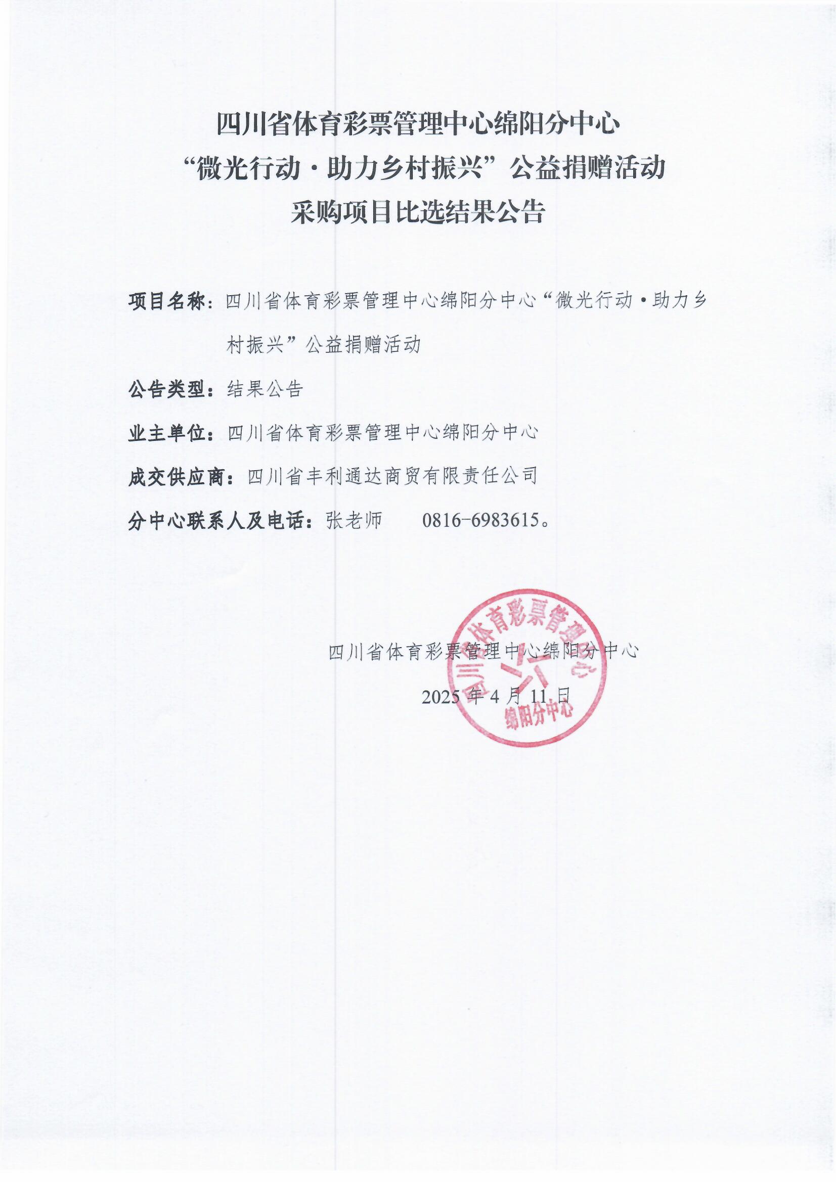 四川省體育彩票管理中心綿陽分中心“微光行動(dòng)·助力鄉(xiāng)村振興”公益捐贈(zèng)活動(dòng)采購項(xiàng)目比選結(jié)果公告
