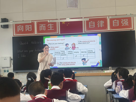 課堂伊始,李雪播放了一首歡快的英文歌曲My Hobbies。學生們隨著節(jié)奏律動,在輕松愉悅的氛圍中迅速融入學習狀態(tài)。接著,她借助Magic Fingers活動,復習了已學短語并自然地導入新課。學生們通過觀察李老師展示的各類愛好圖片,踴躍開口嘗試表達:“She likes dancing?”“He likes playing football?”課堂氛圍熱烈,活力四射。