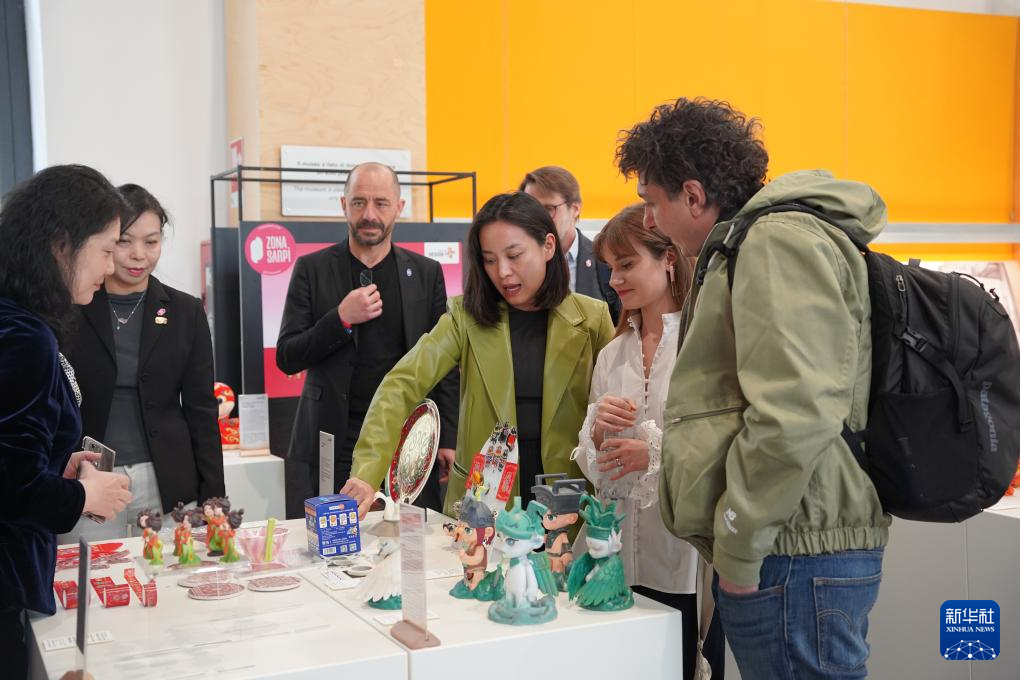 4月7日,設計師在意大利米蘭設計周中國周的文創(chuàng)中國精品展區(qū)為游客介紹設計理念。新華社發(fā)(米蘭設計周中國周主辦方供圖)