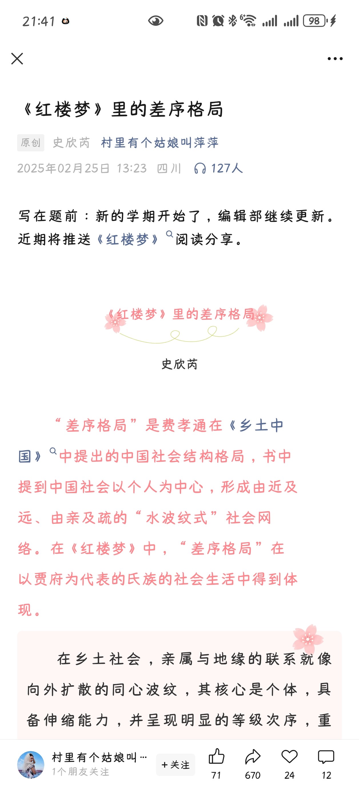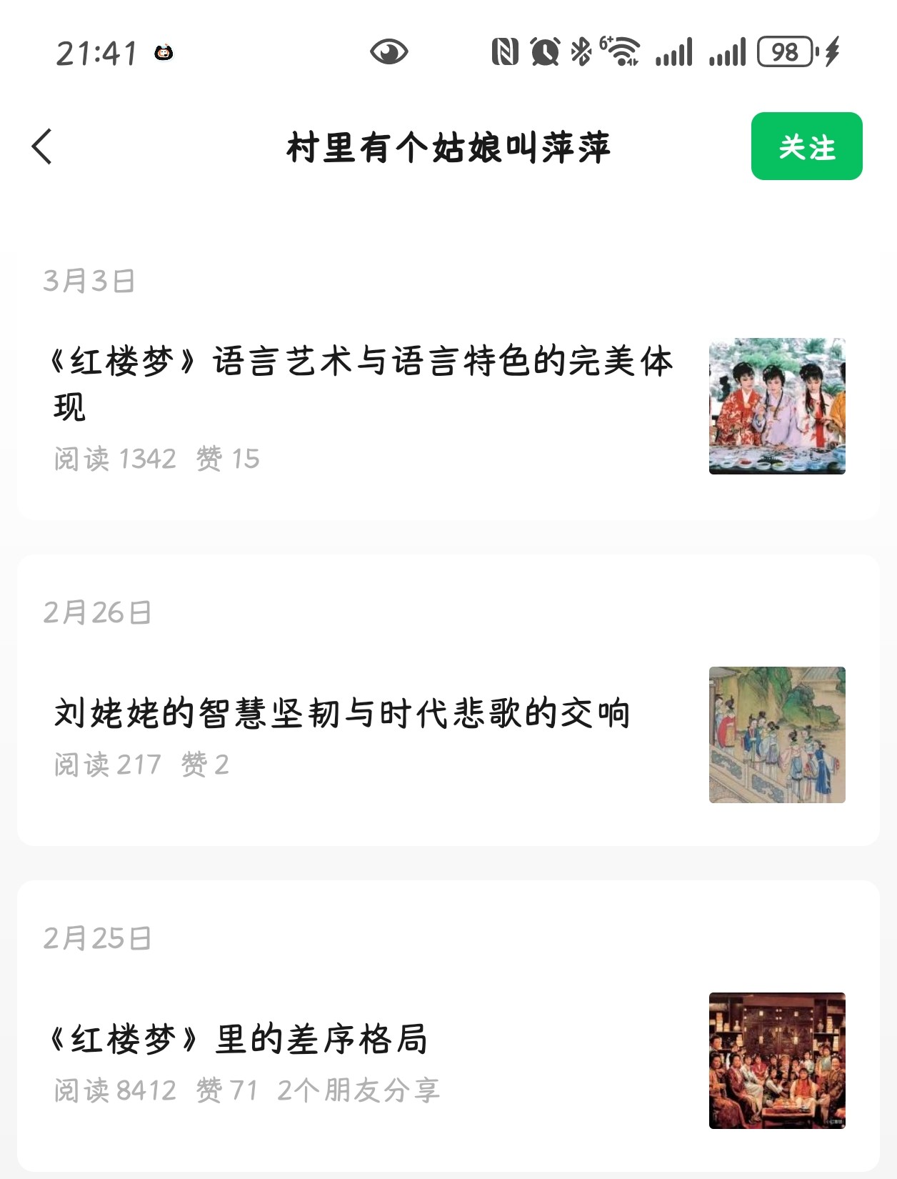 參賽指導(dǎo)老師林春萍回憶起史欣芮創(chuàng)作過程時仍難掩激動:“接到比賽通知次日,她就發(fā)來提綱,一周后交稿,不到兩小時一氣呵成,連標點都極少改動。”在林老師眼中,史欣芮的“天才”背后是日復(fù)一日的積淀:班級公眾號“村里有個姑娘叫萍萍”里,她的《〈紅樓夢〉里的差序格局》曾獲得8000+閱讀量;班上每月會印制一本學(xué)生散文隨筆集,作為主編的史欣芮文學(xué)造詣早已初見端倪:她的文字總能以小見大,將日常觀察升華為對文化的思考。