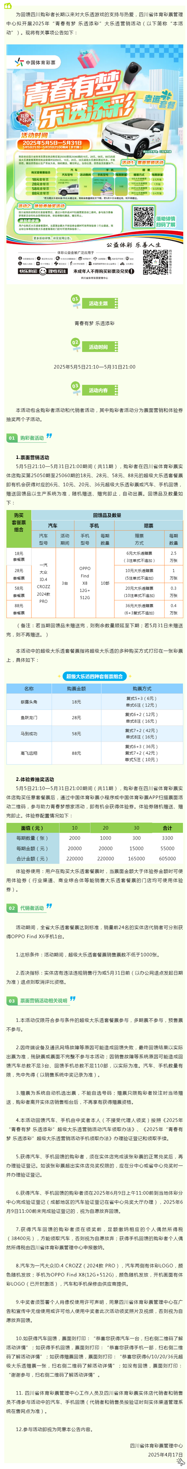 【公告】四川省體育彩票管理中心關(guān)于開展2025年“青春有夢 樂透添彩”大樂透營銷活動的公告