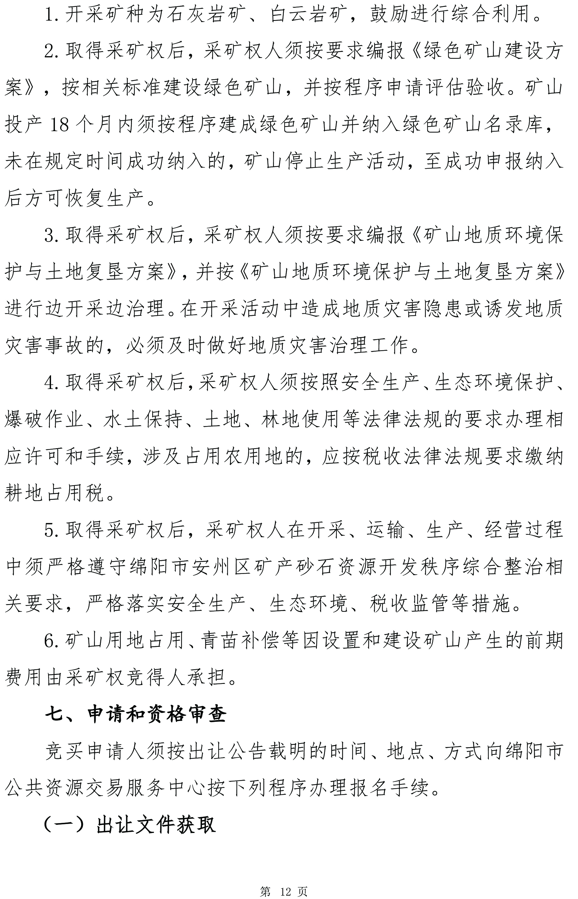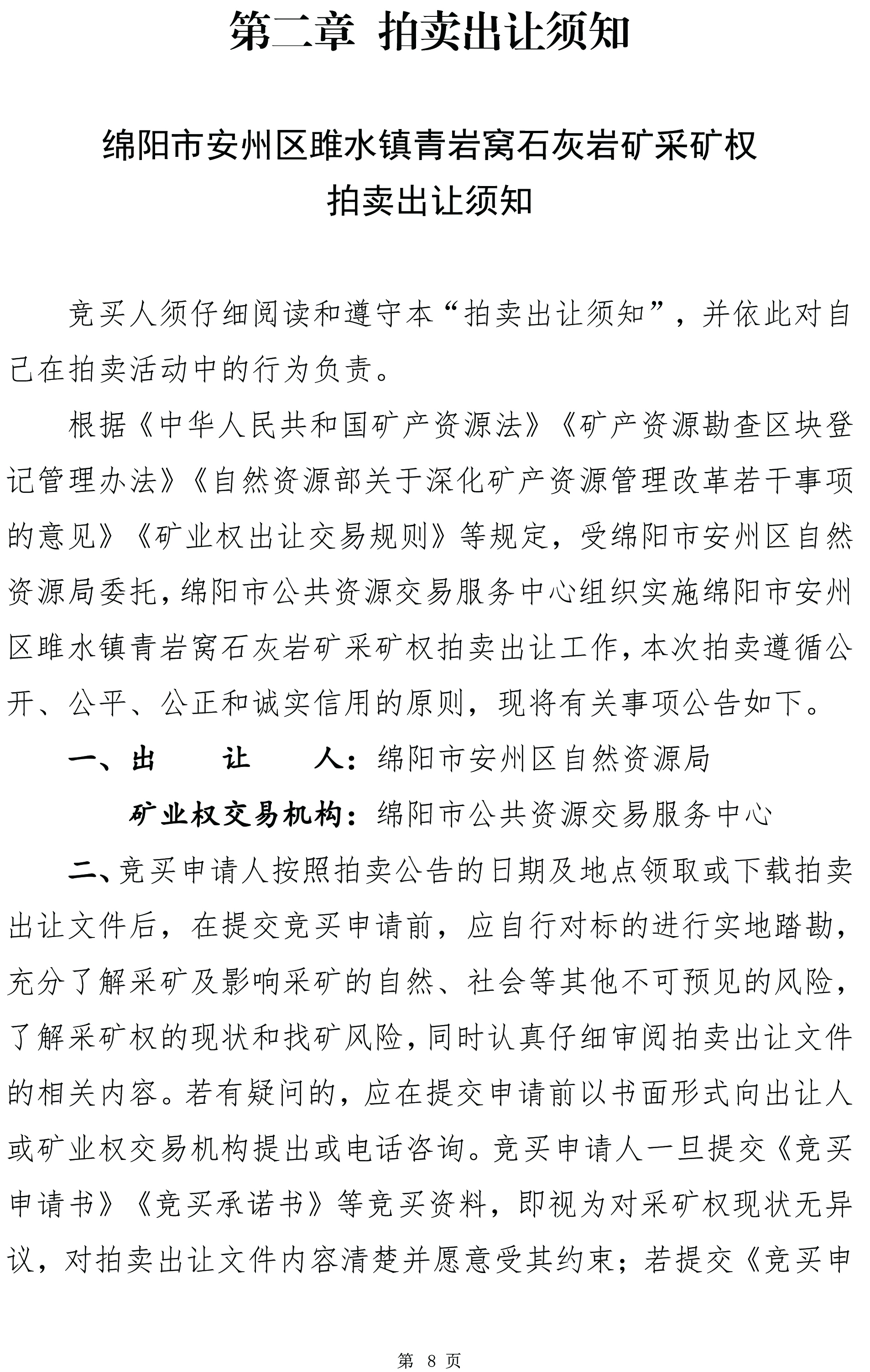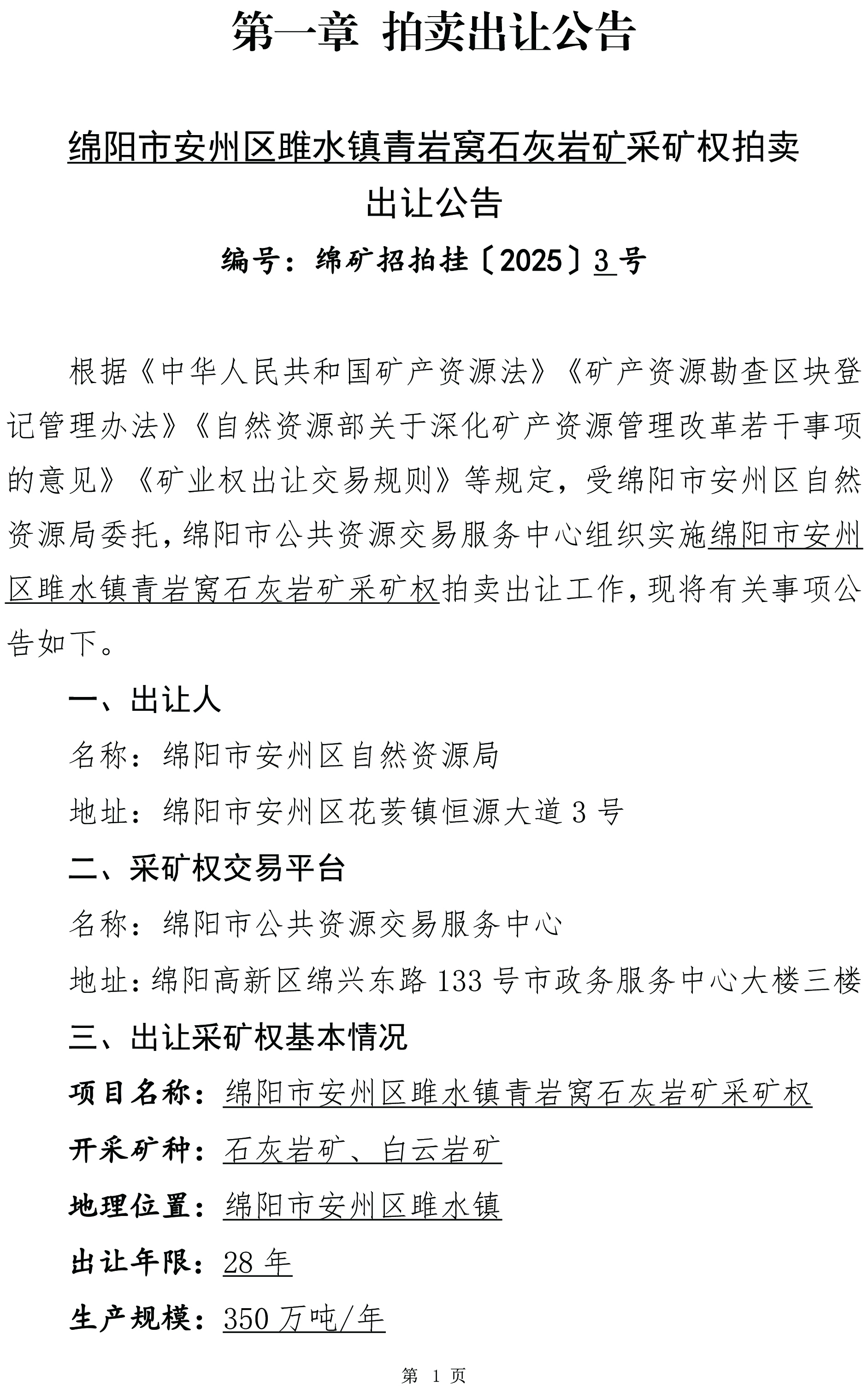 綿陽(yáng)市安州區(qū)雎水鎮(zhèn)青巖窩石灰?guī)r礦拍賣出讓文件(編號(hào):綿礦招拍掛〔2025〕3號(hào))