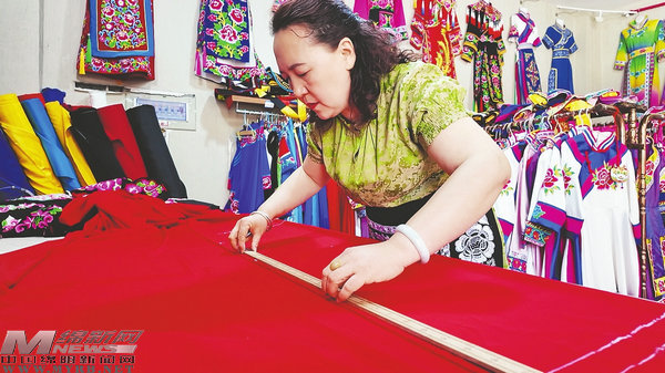 “我們一直在進行創(chuàng)新,比如這一款衣服,不管是做工還是走線都非常精細,做出來后大家都比較喜歡,銷量也比較好,這個花才繡出來,就已經(jīng)訂了幾十套了。”余英一邊向記者介紹,一邊展示店里的服裝。