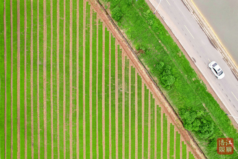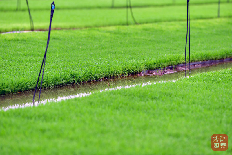 在村道兩側(cè),大片水田正鋪展新綠,一壟壟長(zhǎng)勢(shì)喜人的優(yōu)質(zhì)秧苗把連片秧田點(diǎn)綴得生機(jī)盎然,好似給大地鋪上了一層濃密的綠毯。