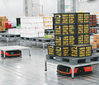 近年來,湖北省襄陽市依托大數(shù)據(jù)、云計算及人工智能等技術(shù),實現(xiàn)物流運作的規(guī)?;?、集約化和智慧化。圖為在襄陽市樊城區(qū)好鄰居生鮮物流中心,兩臺智能運送機(jī)器人在貨物運送軌道上相遇后,按優(yōu)先級先后通過。新華社記者 黃曉勇攝
