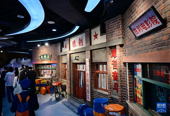 4月28日,觀眾在青島電影博物館勝利電影院場景復(fù)原展區(qū)參觀。
