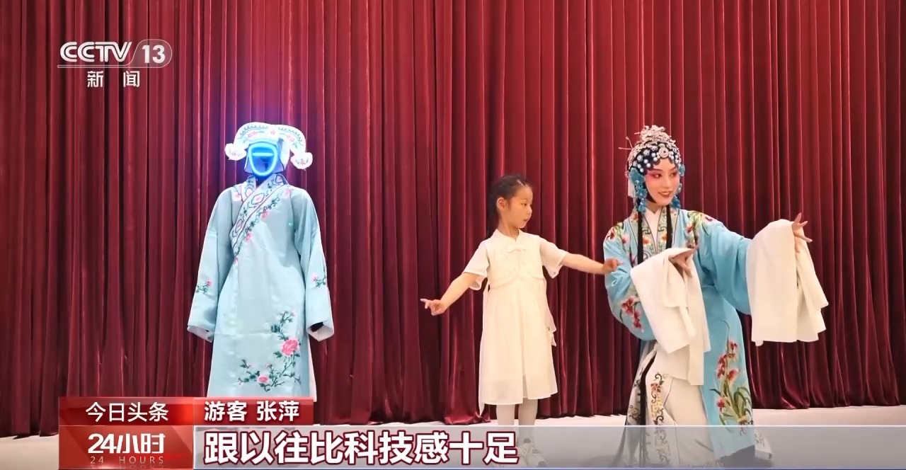 “五一”假期,江蘇鹽城建湖九龍口淮劇小鎮(zhèn)化身科技戲臺,機器人演員與梨園名家同臺獻藝、默契共舞。