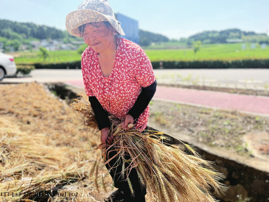 農(nóng)戶沈清林在運糧車旁,興奮地捧起一把麥粒向記者展示:“你看,這麥子長得多好,顆粒大而飽滿。之前還擔(dān)心收成,現(xiàn)在看來,產(chǎn)量非常可觀。”他有3畝多小麥地,一大早就聯(lián)系了收割機,不到兩個小時,小麥就收割完了,“機器收割很快很方便,趁著這兩天天氣好,我們好把麥子曬干。”沈清林說。