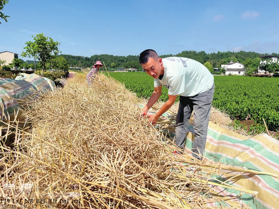 進入5月,菜籽莢由綠變黃,發(fā)出沉甸甸的聲響,到了收割的最佳時機。5日上午,記者在涪城區(qū)楊家鎮(zhèn)萬和村看到,田間地頭男女老少齊心協(xié)力,手持鐮刀,彎腰割下一根根飽滿的油菜稈,并整齊地堆放在一起。隨著連枷有力地拍打菜籽稈,一顆顆飽滿的菜籽從莢中紛紛脫落,金黃的菜籽沐浴著陽光,閃爍著耀眼的光芒,等待著完全干燥。“還是種油菜好,油菜籽榨油,不光可以自家吃,還能賣出去。”萬和村村民陳建說。