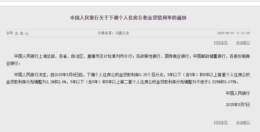 中國(guó)人民銀行發(fā)布關(guān)于下調(diào)個(gè)人住房公積金貸款利率的通知:中國(guó)人民銀行決定,自2025年5月8日起,下調(diào)個(gè)人住房公積金貸款利率0.25個(gè)百分點(diǎn),5年以下(含5年)和5年以上首套個(gè)人住房公積金貸款利率分別調(diào)整為2.1%和2.6%,5年以下(含5年)和5年以上第二套個(gè)人住房公積金貸款利率分別調(diào)整為不低于2.525%和3.075%。