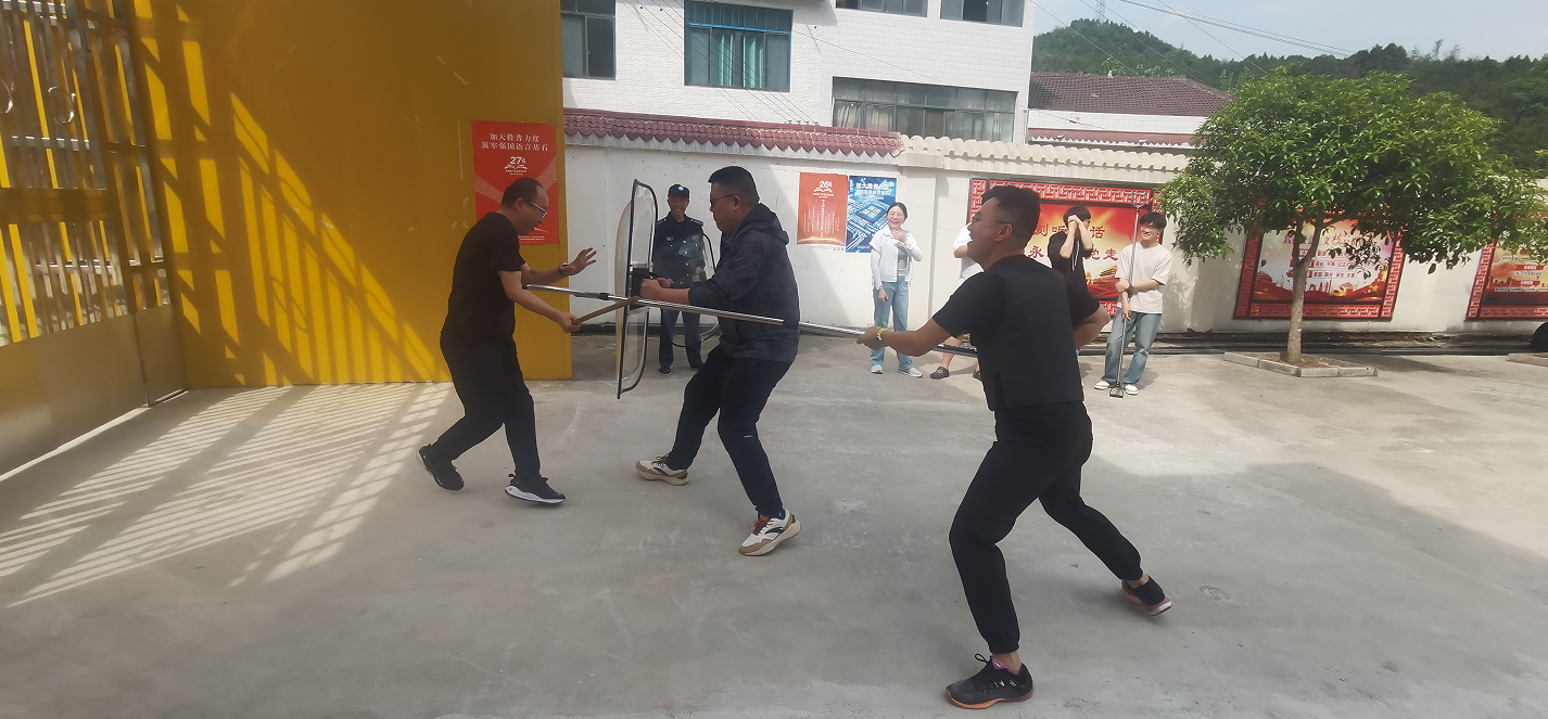 演練現(xiàn)場模擬了疑似危險人員企圖闖入校園的緊急場景。該校安保人員迅速反應,立即啟用防暴盾牌、鋼叉等防暴器械,組成防線進行阻攔。同時,該校應急響應機制迅速啟動,相關教師按照預案分工協(xié)作,一部分負責組織學生有序撤離至安全區(qū)域,另一部分協(xié)助安保人員控制局面。