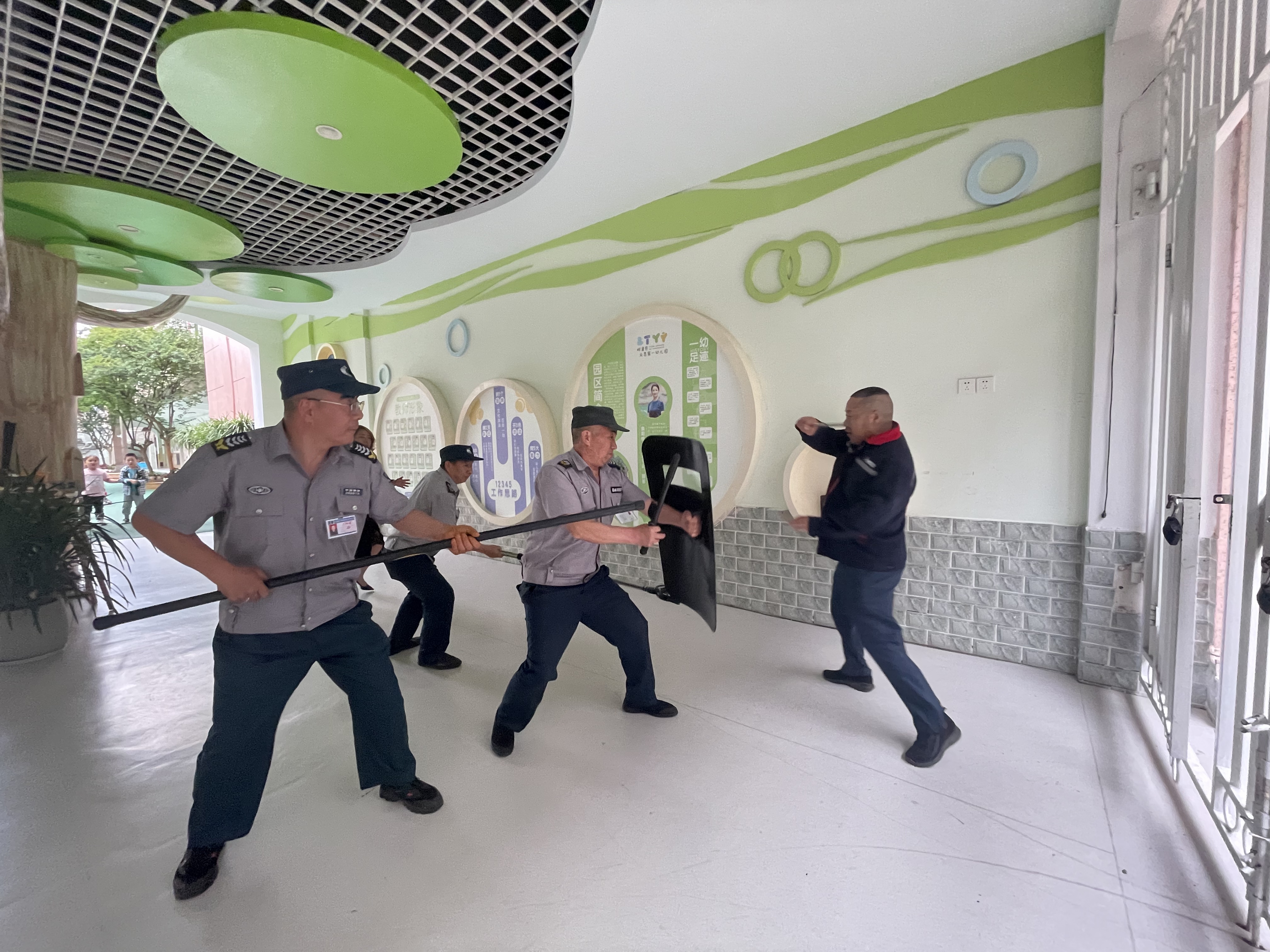 演練模擬“歹徒闖入校園”的突發(fā)事件場景。一名由工作人員扮演的“歹徒”試圖強(qiáng)行闖入幼兒園,保安人員立即啟動(dòng)應(yīng)急預(yù)案,第一時(shí)間按下一鍵式報(bào)警按鈕,并使用防暴器械與“歹徒”周旋。同時(shí),幼兒園最小應(yīng)急單元成員迅速響應(yīng),按照預(yù)案分工疏散幼兒至安全區(qū)域;協(xié)助保安人員制服“歹徒”;維持現(xiàn)場秩序并安撫幼兒情緒。整個(gè)演練過程緊張有序,各環(huán)節(jié)銜接緊密,充分展現(xiàn)了該園教職工的應(yīng)急處置能力。