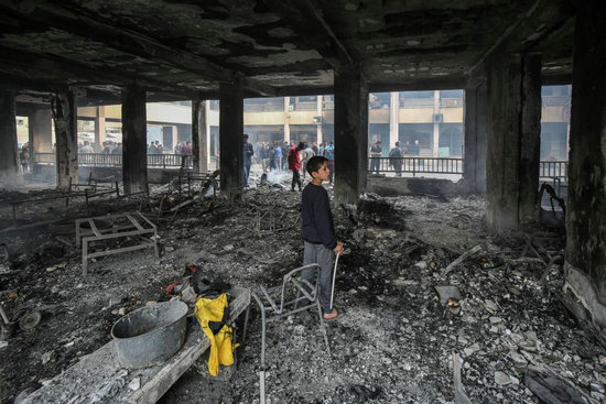 4月23日,在加沙地帶北部加沙城,人們查看以軍襲擊后的學校。新華社發(fā)(里澤克·阿卜杜勒賈瓦德攝)