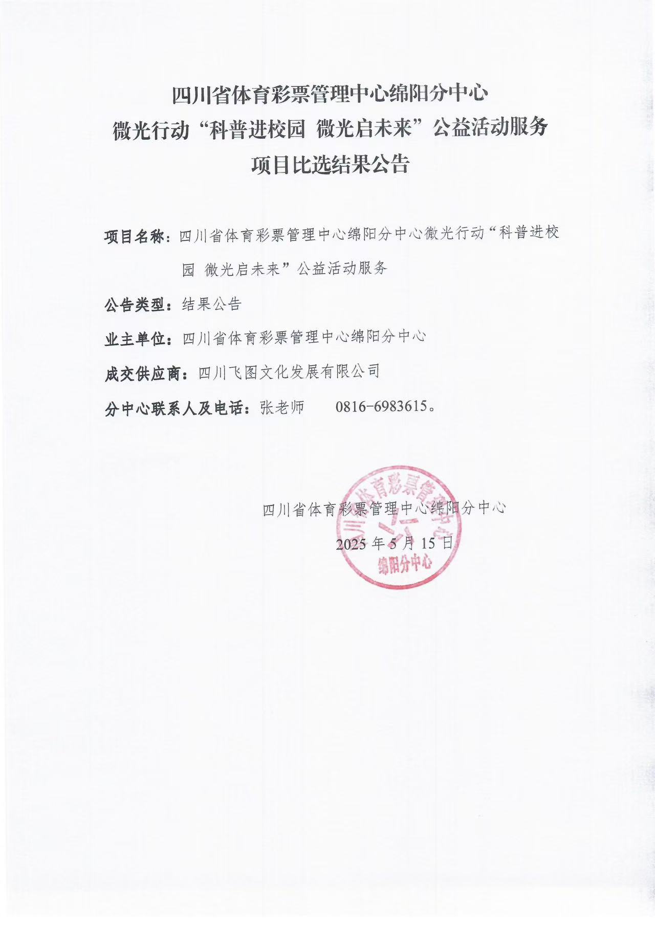 四川省體育彩票管理中心綿陽分中心微光行動“科普進校園微光啟未來”公益活動服務項目比選結果公告