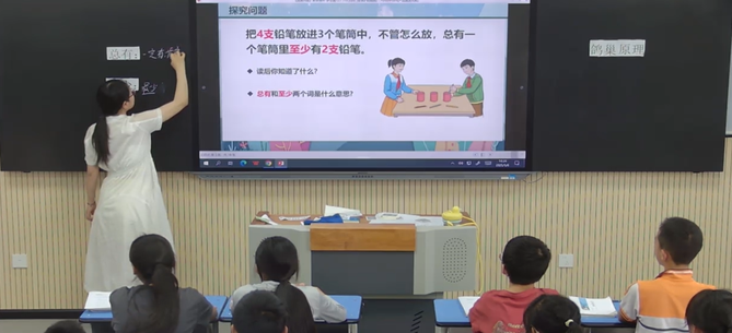 課堂上,羅亞鑫老師從生活中的現(xiàn)象入手,用4支鉛筆和3個(gè)筆筒,通過讓學(xué)生擺一擺,畫一畫,寫一寫等教學(xué)方法引導(dǎo)學(xué)生理解“總有”“至少”。通過自主探究學(xué)生們讓學(xué)生積極參與課堂互動(dòng),運(yùn)用枚舉法和假設(shè)法讓學(xué)生進(jìn)一步理解鴿巢原理,在思考與討論中不斷探索知識(shí)的奧秘。