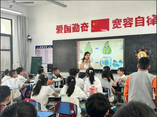 音樂教師譚力文執(zhí)教的《黃葛樹下》以四川童謠為切入點,通過節(jié)奏創(chuàng)編與多聲部合唱,引導學生感悟音樂魅力。譚老師吉他、口風琴、鋼琴、雙響筒等樂器的展示,充分體現(xiàn)出過硬的專業(yè)水平。拓展環(huán)節(jié)中,體育元素跳皮筋的融入,提升了學生的學習興趣,真正做到了在玩中學,在學中樂。