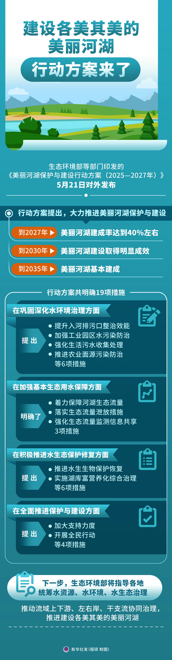 新華社北京5月21日電(記者高敬)生態(tài)環(huán)境部等部門印發(fā)的《美麗河湖保護與建設行動方案(2025—2027年)》21日對外發(fā)布。這份行動方案提出,大力推進美麗河湖保護與建設,到2027年,美麗河湖建成率達到40%左右;到2030年,美麗河湖建設取得明顯成效;到2035年,美麗河湖基本建成。