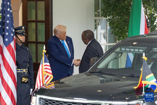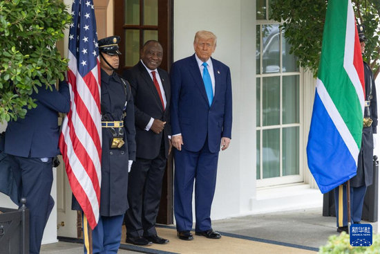 5月21日,美國(guó)總統(tǒng)特朗普(左二)在華盛頓白宮迎接到訪的南非總統(tǒng)拉馬福薩。新華社記者 胡友松 攝