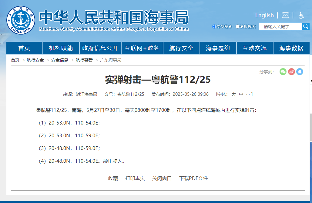 據(jù)中國海事局網(wǎng)站消息,湛江海事局發(fā)布航行警告,5月27日至30日,每天8時(shí)至17時(shí),南海部分海域進(jìn)行實(shí)彈射擊,禁止駛?cè)搿?/p>