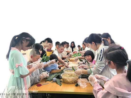 孩子們在文同詩竹園清風(fēng)館內(nèi)學(xué)習(xí)包粽子
