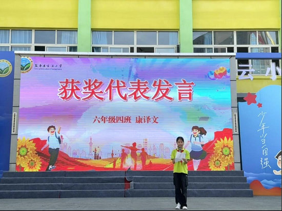 獲獎學生代表六年級四班的康譯文同學上臺發(fā)言,分享了“堅持努力、感恩師長”的成長感悟,號召同學們以夢想為帆,在新征程中勇敢前行。