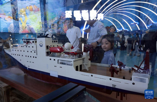 6月7日,一名小朋友在展覽現(xiàn)場觀看“大洋號”綜合調(diào)查船模型。