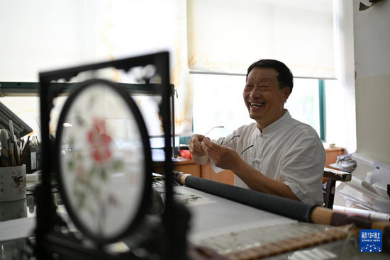 6月6日,在東臺(tái)嘉麗發(fā)繡廠,東臺(tái)發(fā)繡傳承人陳伯余工作前擦拭眼鏡。
